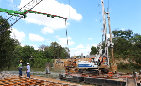 Estão ainda em andamento os trabalhos de: corte e retirada de terra para acesso, e execução do primeiro apoio da ponte; contenção do barranco com execução do solo; montagem da armação e preparação para o apoio da ponte.