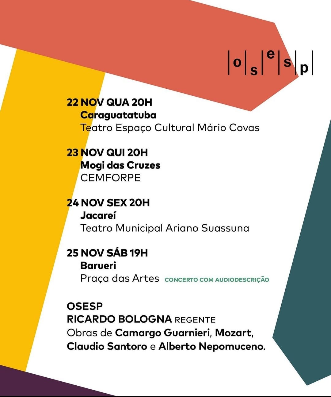 O Projeto OSESP – Criado em 2008, o projeto Osesp Itinerante percorre anualmente cidades do interior e do litoral paulista a fim de democratizar ainda mais o acesso à música clássica. A turnê passará nesta edição por teatros das cidades de Barueri, Caraguatatuba, Fernandópolis, Garça, Jacareí, Mogi das Cruzes, Presidente Prudente e São José do Rio Preto.