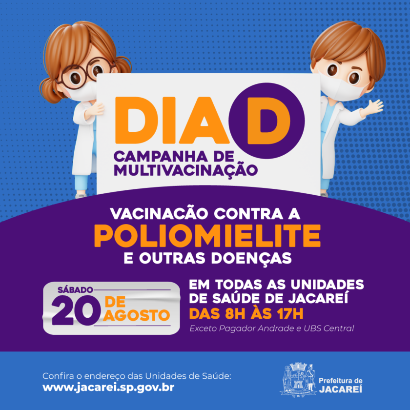 A Prefeitura de Jacareí, por meio da Secretaria de Saúde, irá promover, no próximo sábado (20), o ‘Dia D de Multivacinação’. A ação será realizada em todas as unidades de Saúde do município (exceto Pagador Andrade e UBS Central), das 8h às 17h, e tem o objetivo de atualizar a caderneta de vacinação de crianças e adolescentes até 14 anos.