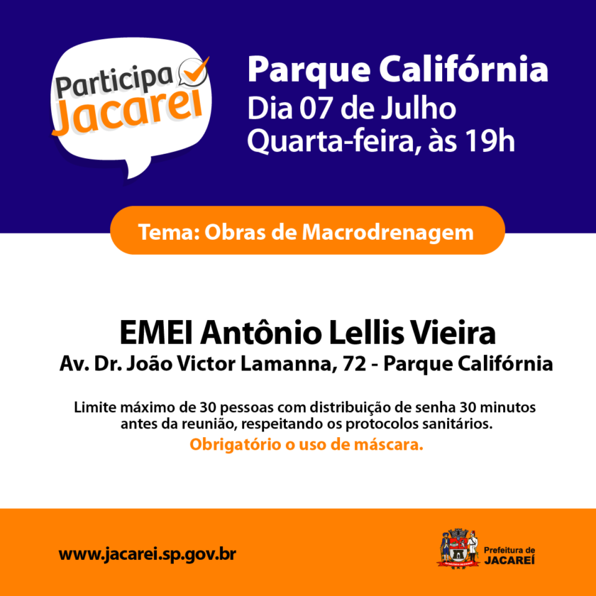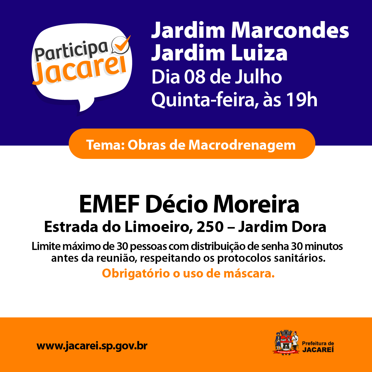 Dois bairros de Jacareí receberão audiências públicas do “Participa Jacareí Especial”, na próxima semana, às 19h. O primeiro encontro será na quarta, dia 7, no Parque Califórnia, na EMEI Antônio Lellis Vieira, localizada na Av. Dr. João Vítor Lamanna, 72. O outro será na quinta, dia 8, para atender a região do Jardim Marcondes e Jardim Luíza, na EMEF Décio Moreira, na Estrada do Limoeiro, 250 – Jardim Dora.