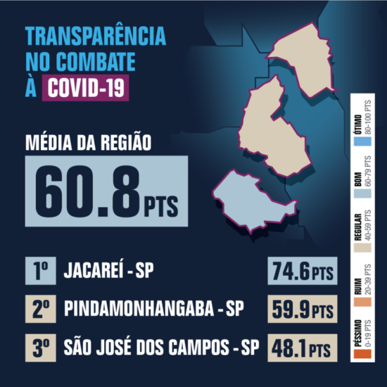 A avaliação do nível de transparência no combate à COVID-19 foi divulgada nesta sexta (5). Na região do Vale do Paraíba, foram avaliados os municípios de Jacareí, Pindamonhangaba e São José dos Campos. A cidade de Jacareí, com 76,6 pontos foi a melhor avaliada e ocuparia o 3º lugar se fosse comparada com as capitais brasileiras no ranking de transparência sobre as contratações emergenciais de enfrentamento da pandemia, segundo divulgou o Observatório.