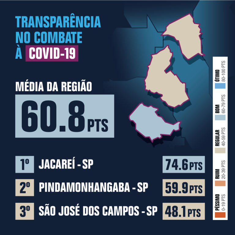 A metodologia foi desenvolvida pela ‘Transparência Internacional – Brasil para o Ranking de Transparência no Combate à COVID-19’, com o objetivo de identificar e promover as melhores práticas de transparência nas informações referentes às contratações emergenciais realizadas em resposta à pandemia. A escala vai de zero a 100 pontos. Os municípios de Pindamonhangaba e São José dos Campos (SJC) ficaram com 56,9 e 48,1 pontos, respectivamente.