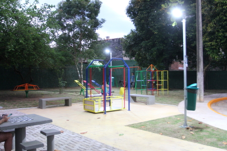Foi instalado um playground, com brinquedos como gangorra, gira-gira, labirinto e balança, além de um brinquedo com acessibilidade, possibilitando o deslocamento da cadeira de rodas. Foram instaladas luminárias de LED, que geram mais segurança e capacidade de uso noturno do espaço.