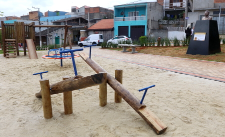 Praça Marielle Franco, na entrada do bairro, e a Praça de Esporte – Projeto Areninha Sensei Paulo Graça. Somadas a outros esforços e compromissos, as praças simbolizam, também, uma nova fase de conquistas e melhorias no bairro, com direitos reconhecidos junto ao Poder Público.