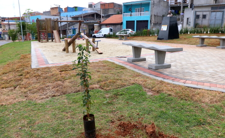 A praça será entregue com calçamento adequado, bancos, pergolado de madeira, playground, paisagismo completo com 17 árvores nativas diversas e iluminação inteira de led.