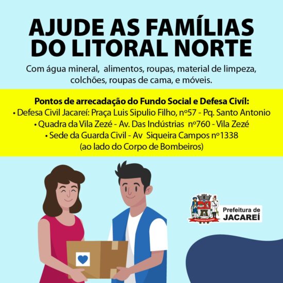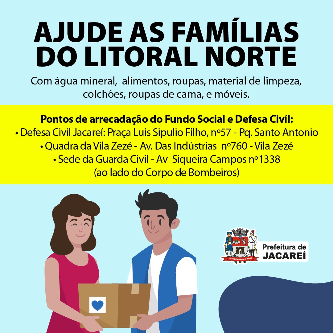 A Defesa Civil, em parceria com o Fundo Social de Solidariedade, de Jacareí, também realiza uma campanha de donativos para a população afetada pelas enchentes em São Sebastião. A ação busca receber doações de água, alimentos, roupas, calçados, material de limpeza, roupas de cama, colchões e móveis. As doações podem ser realizadas em três postos de coleta: