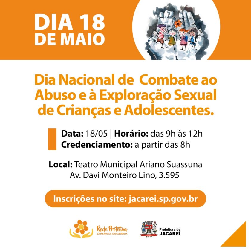 A Prefeitura de Jacareí, por meio da Comissão da Rede Protetiva da Infância e Adolescência de Jacareí, está com inscrições abertas para o evento especial do Dia Nacional de Combate ao Abuso e Exploração Sexual de Crianças e Adolescentes. As inscrições devem ser feitas exclusivamente pela internet, clicando aqui.