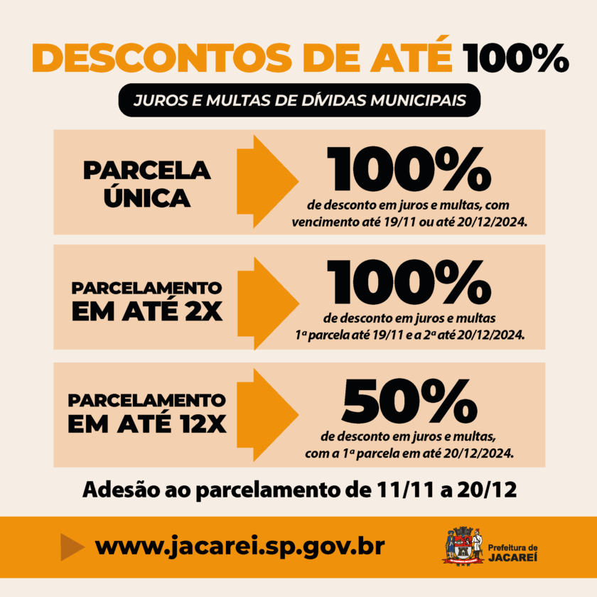 – Parcela única: 100% de desconto em juros e multas, para pagamento integral com vencimento até 19 de novembro ou até 20 de dezembro de 2024.