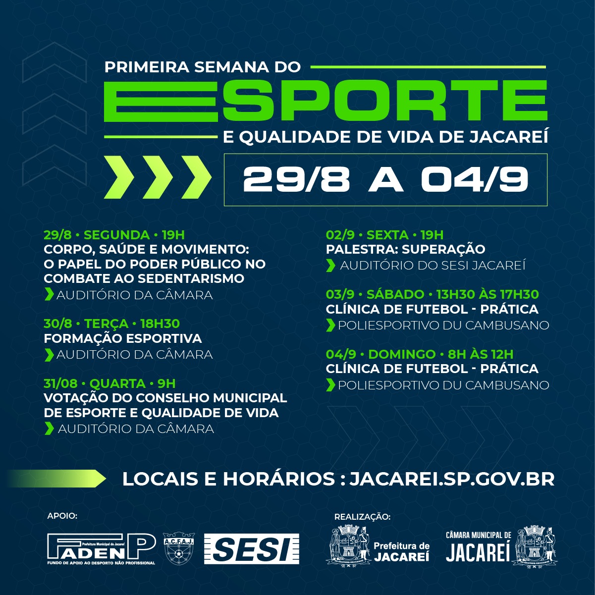 A Prefeitura de Jacareí, por meio da Secretaria de Esportes & Recreação, realizará a ‘1ª Semana do Esporte e Qualidade de Vida’, entre os dias 29 de agosto e 4 de setembro. O evento será aberto ao público e contará com uma ampla programação de palestras, formações, discussões e atividades práticas.