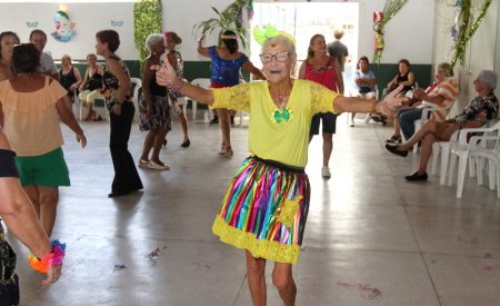 Vestindo uma saia colorida e blusa amarela customizadas, a aposentada Roberta Juvenil Pereira, 74 anos, conta que fez a própria fantasia. “Eu adoro Carnaval. Achei ótima essa ideia de promover uma matinê aqui na Casa e há dois dias decidi confeccionar minha própria fantasia”.