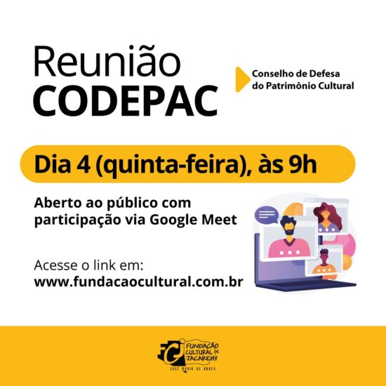 Nesta próxima quinta-feira (4), será realizada de maneira on-line, a primeira reunião de 2021 do CODEPAC (Conselho de Defesa do Patrimônio Cultural). O encontro aberto ao público será às 9h, pelo Google Meet. Os interessados em participar devem acessar o seguinte link: https://meet.google.com/jju-