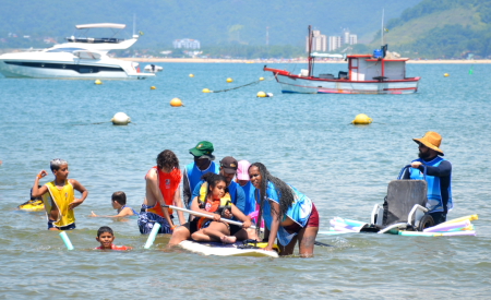 Pensando na inclusão de todos, a Secretaria de Esportes & Recreação de Jacareí fez uma parceria com a Prefeitura de Caraguatatuba, que cedeu uma cadeira de rodas anfíbia, para que crianças cadeirantes também pudessem participar das atividades e entrar no mar.