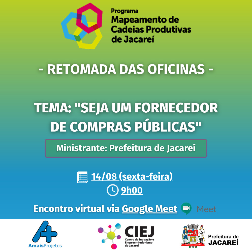 O Programa de Mapeamento de Cadeias Produtivas de Jacareí, lançado em 2018, retorna às atividades nesta sexta-feira (14), às 9h, com oficinas virtuais. O tema é: “Seja um Fornecedor de compras públicas”. Para participar deste primeiro encontro, é necessário realizar a inscrição por meio deste link.