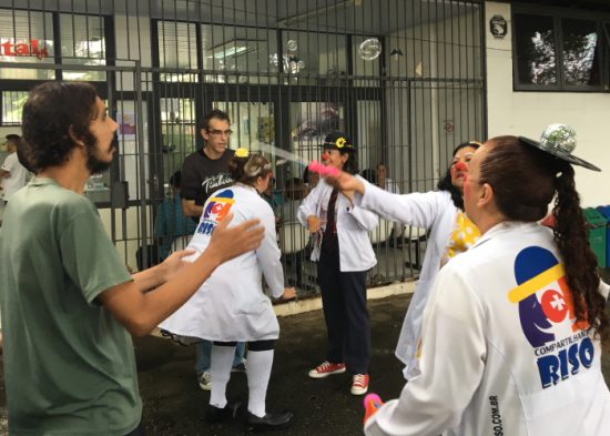 O grupo ‘Oficina do Riso’, que costuma fazer um trabalho em hospitais, teve uma experiência diferente durante visita ao CAPS II e divertiu a todos com palhaçadas, músicas e brincadeiras. “Para o palhaço, todas as pessoas que ele encontra é um paciente, sem nenhuma distinção. É muita alegria ver que eles estão se divertindo enquanto a gente pode estimular a criatividade e proporcionar um momento diferente da rotina deles”, comemora a presidente da associação Oficina do Riso e também palhaça, Poliana Riso.