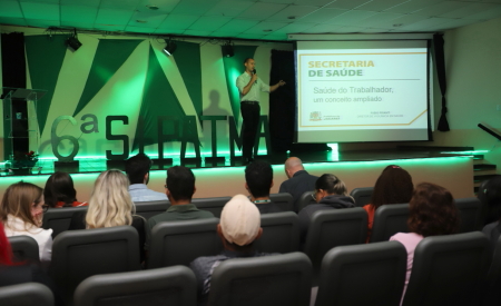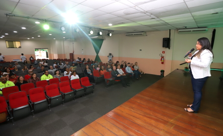 Legenda: SIPATMA – Semana Interna de Prevenção ao Acidente de Trabalho e do Meio Ambiente – reúne servidores no auditório da Secretaria Municipal de Educação