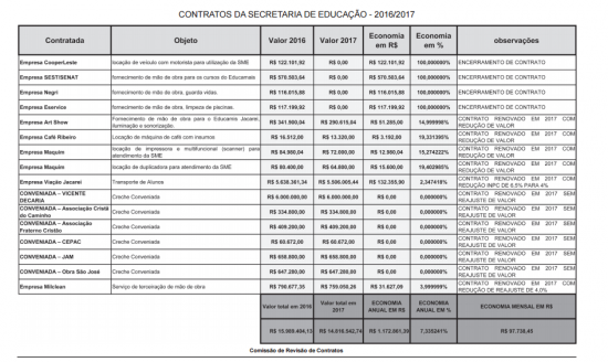 No ano de 2016, a Secretaria de Administração gastou R$ 4,54 milhões nos contratos firmados com 17 empresas. Neste ano, a pasta projeta um gasto de R$ 2,64 milhões, correspondendo a uma economia de 41,7%.