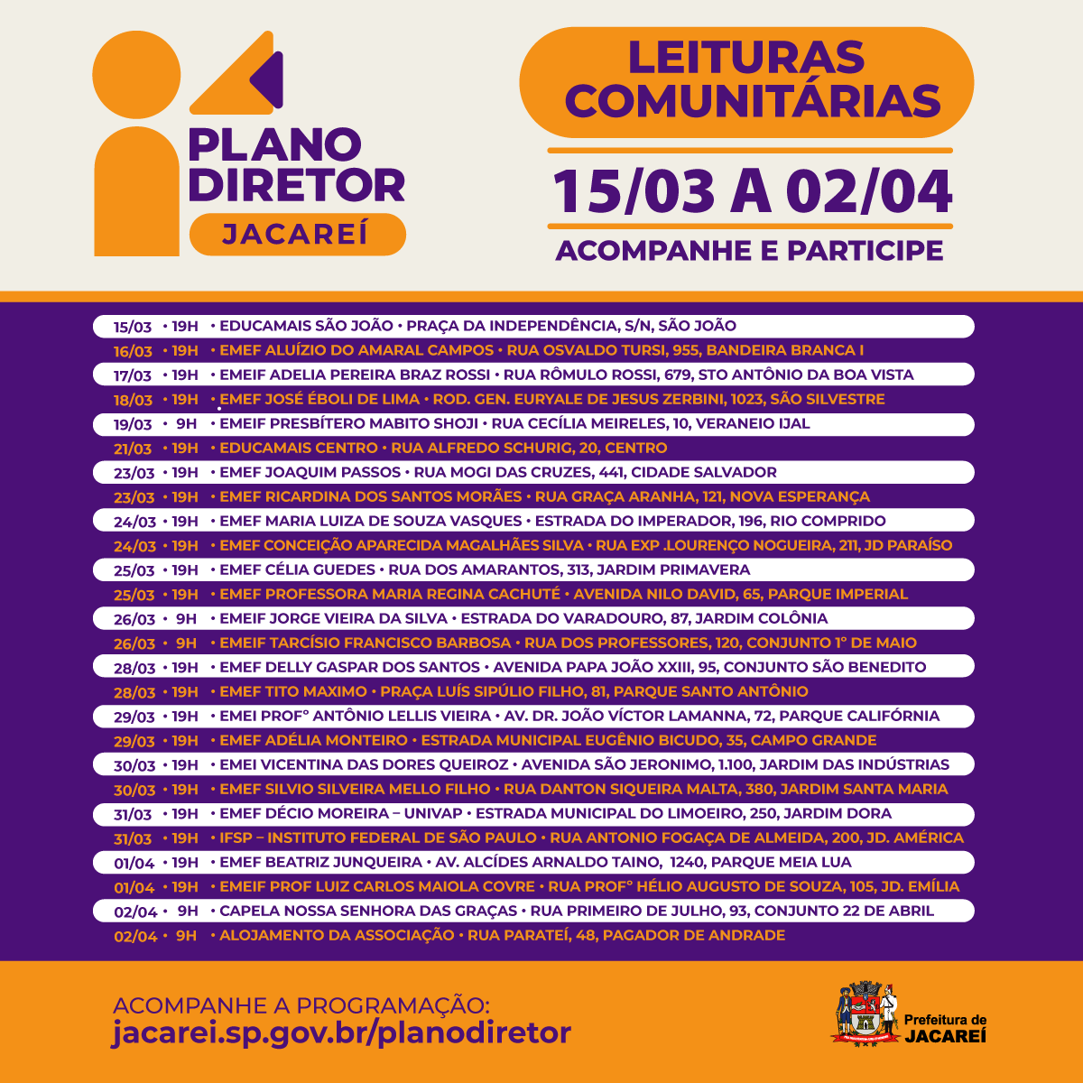 Na nova fase da revisão, os participantes conhecerão o resultado da Leitura Crítica da Cidade, diagnóstico feito pelos professores da universidade, desenvolvido a partir da análise dos dados levantados nas Leituras Comunitárias e no Caderno de Leitura Técnica, documento que contém dados oficiais do Município disponibilizados por institutos de pesquisa.