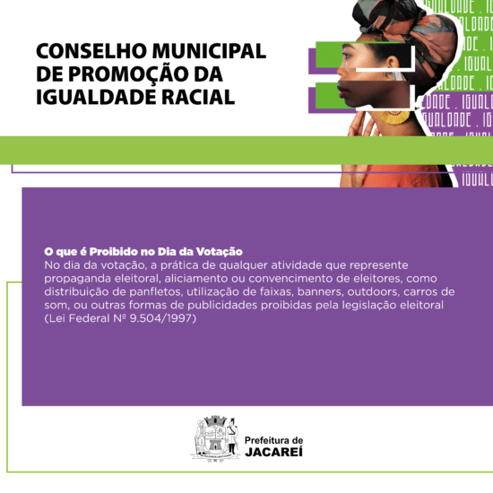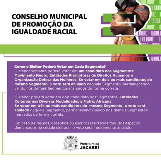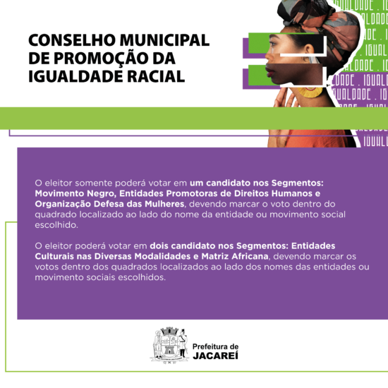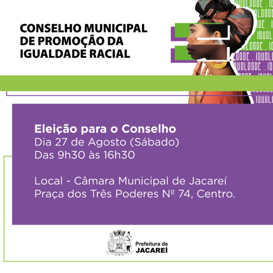No sábado (27) será realizada a eleição do Conselho Municipal de Promoção da Igualdade Racial (CMPIR), das 9h30 às 16h30, no Auditório da Câmara Municipal de Jacareí (Praça dos Três Poderes, nº 74, Centro). A Prefeitura de Jacareí, por meio da Subsecretaria de Igualdade e Direitos Humanos, convida toda a população para participar da votação.