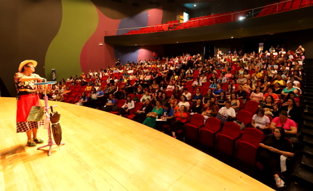 A abertura do evento contou com uma contação de história da Nazaré Lelé. Em seguida, a secretária de Educação, Maria Thereza Ferreira Cyrino parabenizou os professores. “Hoje são mostras de alguns trabalhos que representam o todo, para compartilhar as possiblidades que temos. Estou feliz com a organização das formações do programa em rede, que coloca as crianças como protagonistas de todas as práticas”, destacou a secretária, acrescentando que o seminário é uma referência da realização de cada escola. “É brilhante o que está sendo feito. Agradeço o empenho e o comprometimento de todos, levando este legado para a vida e para a humanidade”, completou.