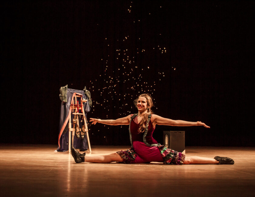 A artista conduz o público em uma jornada singular, acompanhada por uma caixa percussiva. Ao som de clarinete, sinos e guizos, ela se move, contorce-se e realiza malabares, criando uma atmosfera emocionante e divertida.