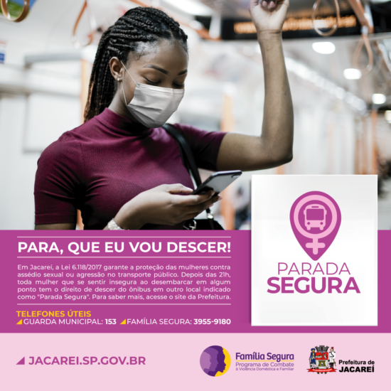 No mês da Mulher, celebrando essa força feminina pautada em igualdade de direitos, reconhecimento e representatividade, a Subsecretaria de Igualdade e de Direitos Humanos, da Prefeitura de Jacareí, retoma a campanha sobre a lei do ‘Parada Segura’, para mulheres que estejam utilizando o itinerário dos ônibus de transporte coletivo na cidade em horário noturno. Esta lei garante o direito das mulheres ao desembarque durante a noite, em locais que não sejam de parada de ônibus, caso o local de desembarque ofereça algum tipo de risco à integridade da mulher. Esta ação envolve, também, as equipes da Secretaria de Mobilidade Urbana.