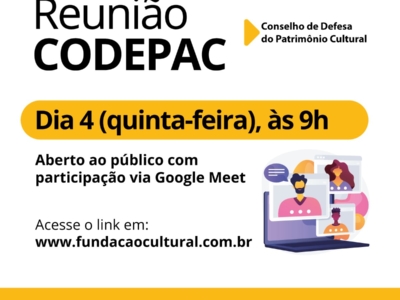 Nesta próxima quinta-feira (4), será realizada de maneira on-line, a primeira reunião de 2021 do CODEPAC (Conselho de Defesa do Patrimônio Cultural). O encontro aberto ao público será às 9h, pelo Google Meet. Os interessados em participar devem acessar o seguinte link: https://meet.google.com/jju-gerh-ywj. De acordo com a Diretora de Patrimônio, a relevância do Conselho é nortear, […]