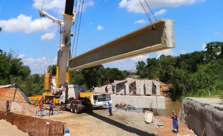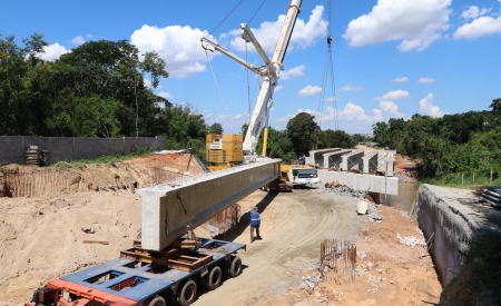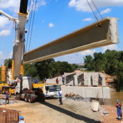 Essas vigas fazem parte da estrutura intermediária da obra de arte especial (termo técnico utilizado para pontes e viadutos), e ficarão posicionadas sobre a fundação no rio, que foi concluída no último mês. Mesmo com as chuvas intensas, continuam acelerados os trabalhos.