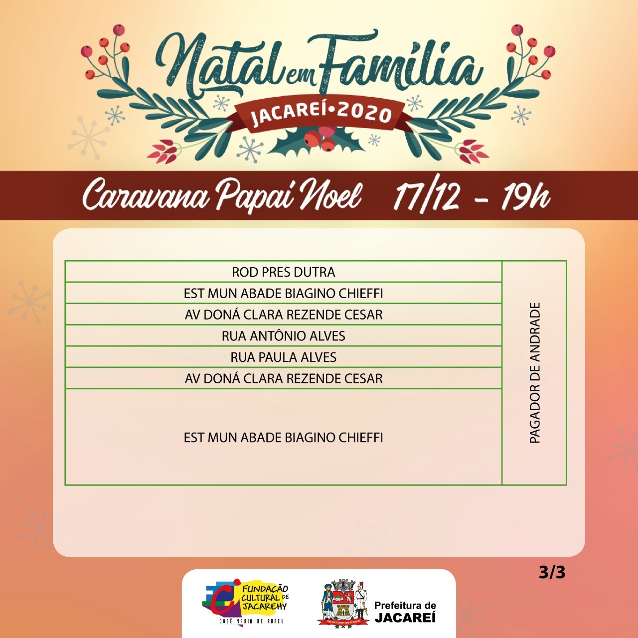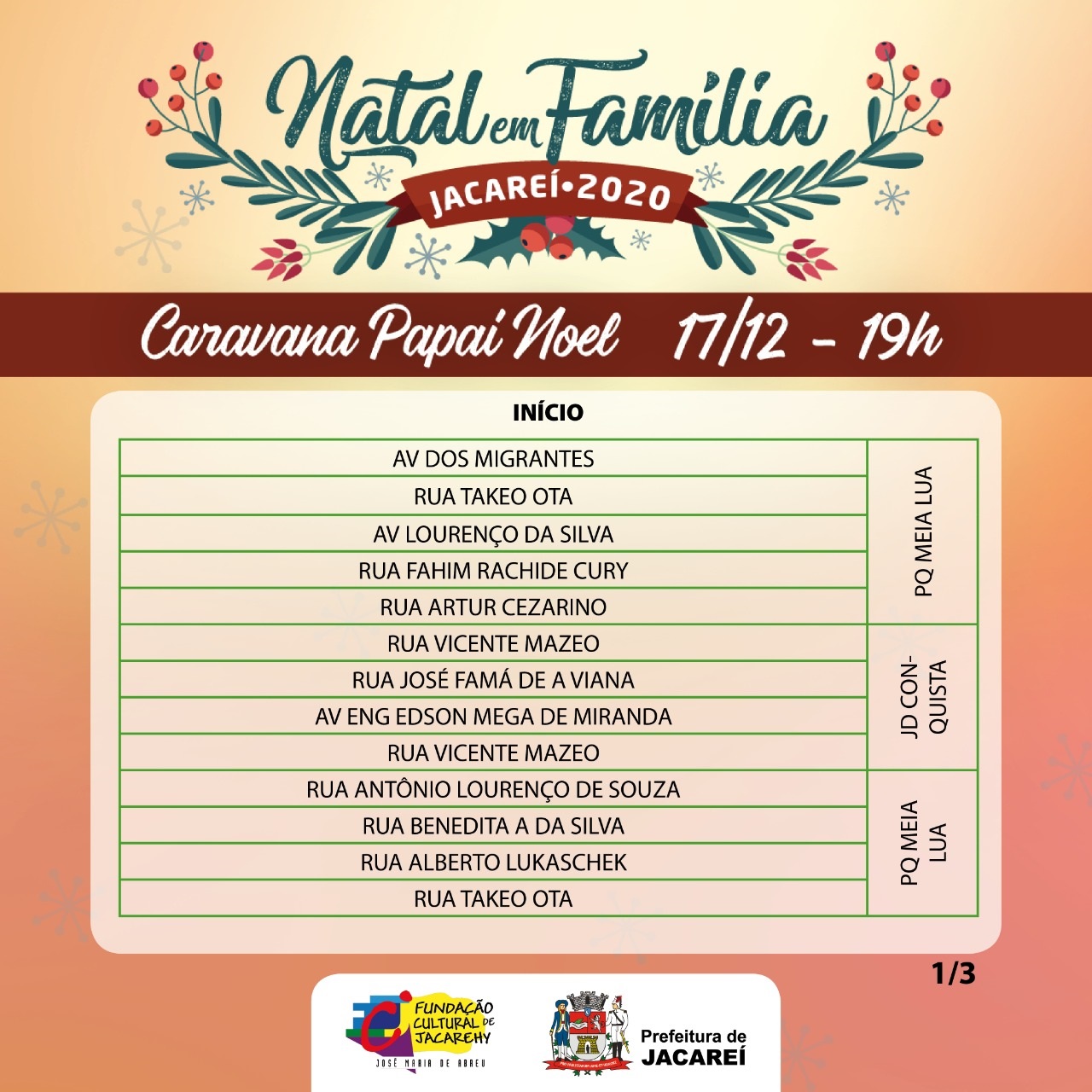 O percurso detalhado, com as ruas informadas, está disponível no site oficial da Prefeitura de Jacareí. Porém, a Secretaria de Mobilidade Urbana informa que, devido ao mau tempo dos últimos dias, se houver fortes chuvas, algumas ruas poderão ser alteradas no momento da caravana.