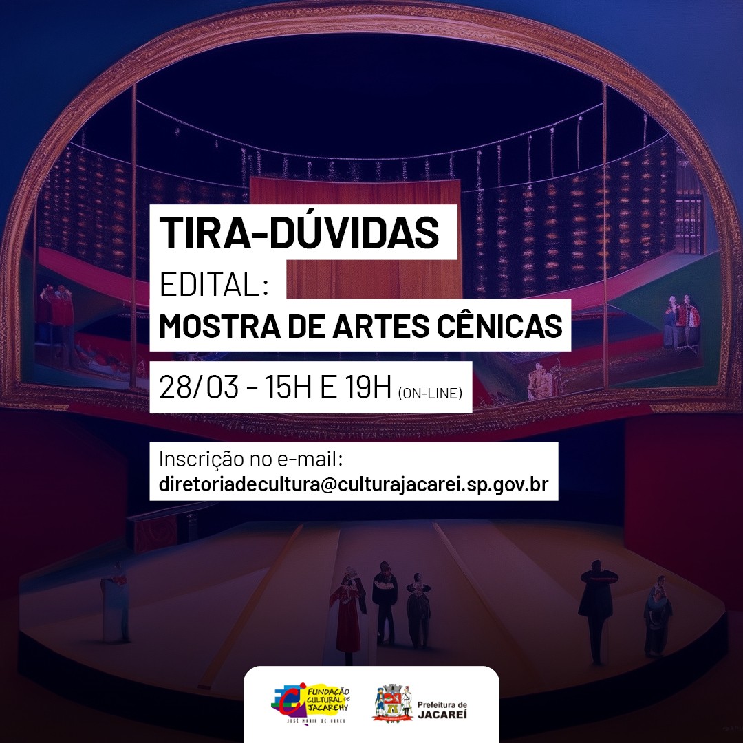 A data do Tira-Dúvidas do Edital da 18ª Mostra de Artes Cênicas de Jacareí mudou para quinta-feira (28). Serão realizados dois encontros de forma online, às 15h e às 19h. Os encontros terão o objetivo de sanar as dúvidas dos proponentes ao Edital e esclarecer quaisquer questões pendentes.