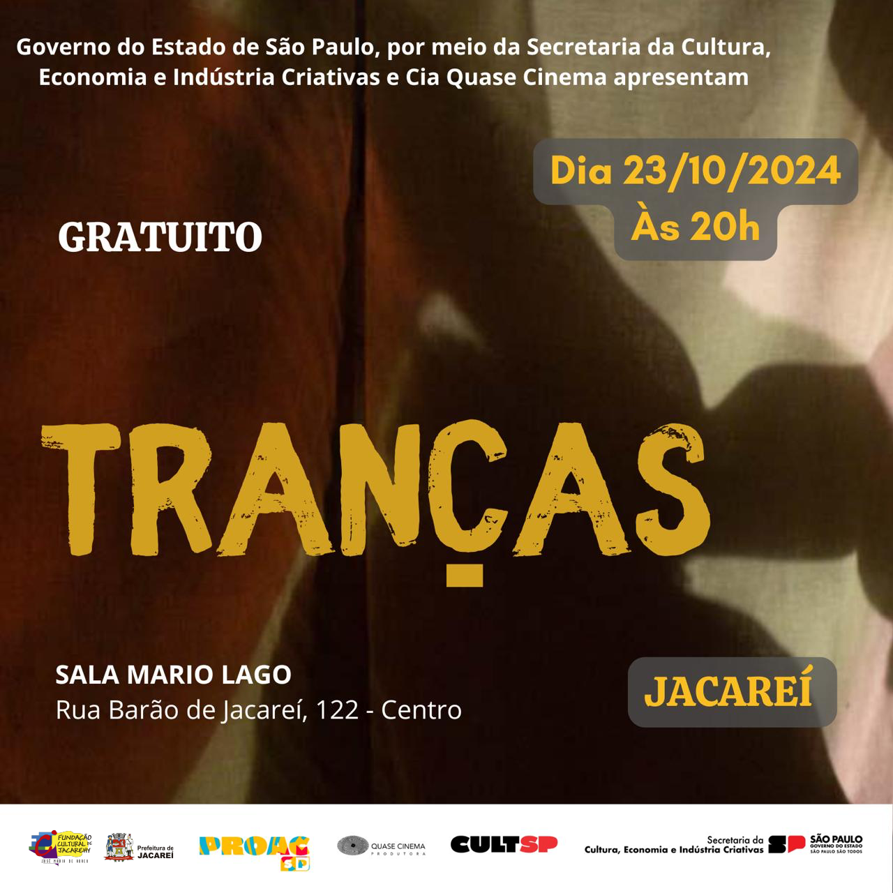Jacareí, nesta quarta-feira (23), às 20h, a Sala Mário Lago, com o apoio da Fundação Cultural de Jacareí (FCJ), apresenta a peça “Tranças – Espetáculo de Sombras”, com classificação livre para todos os públicos. Inspirado na força da guerreira Dandara dos Palmares, o espetáculo “Tranças” busca contar a memória e a história de mulheres pretas diaspóricas por meio da dança, da música e das artes visuais e cênicas. A história é representada pela Cia Quase Cinema, que atua desde 2004 e transita por várias linguagens artísticas.