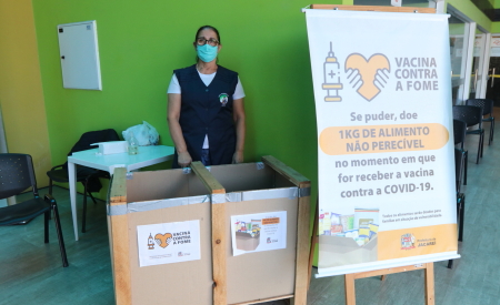 Ação incentiva pessoas a doarem um quilo de alimento não perecível no momento em que forem tomar a vacina contra a Covid-19