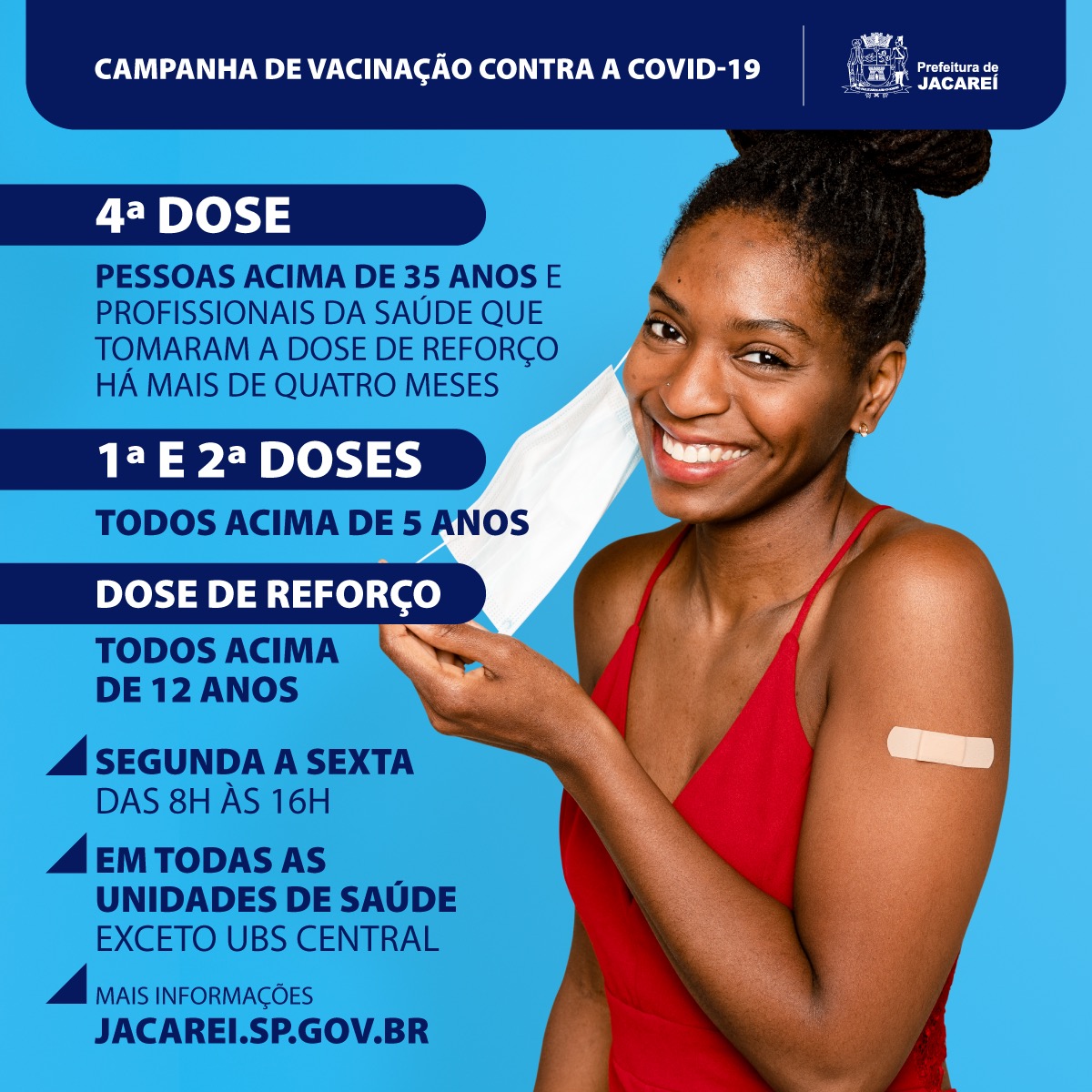 A Prefeitura de Jacareí, por meio da Secretaria de Saúde, inicia na sexta-feira (29), a aplicação da quarta dose para o público de 35 anos ou mais, que tenha tomado a terceira dose há pelo menos quatro meses. A população pode se vacinar em todas as Unidades de Saúde do município (com exceção da UBS Central), de segunda a sexta-feira, das 8h às 16h, sem agendamento. Confira o endereço das Unidades de Saúde de Jacareí, clicando aqui.