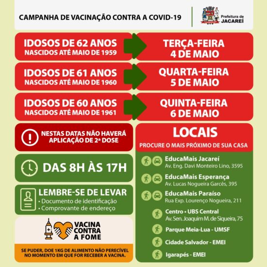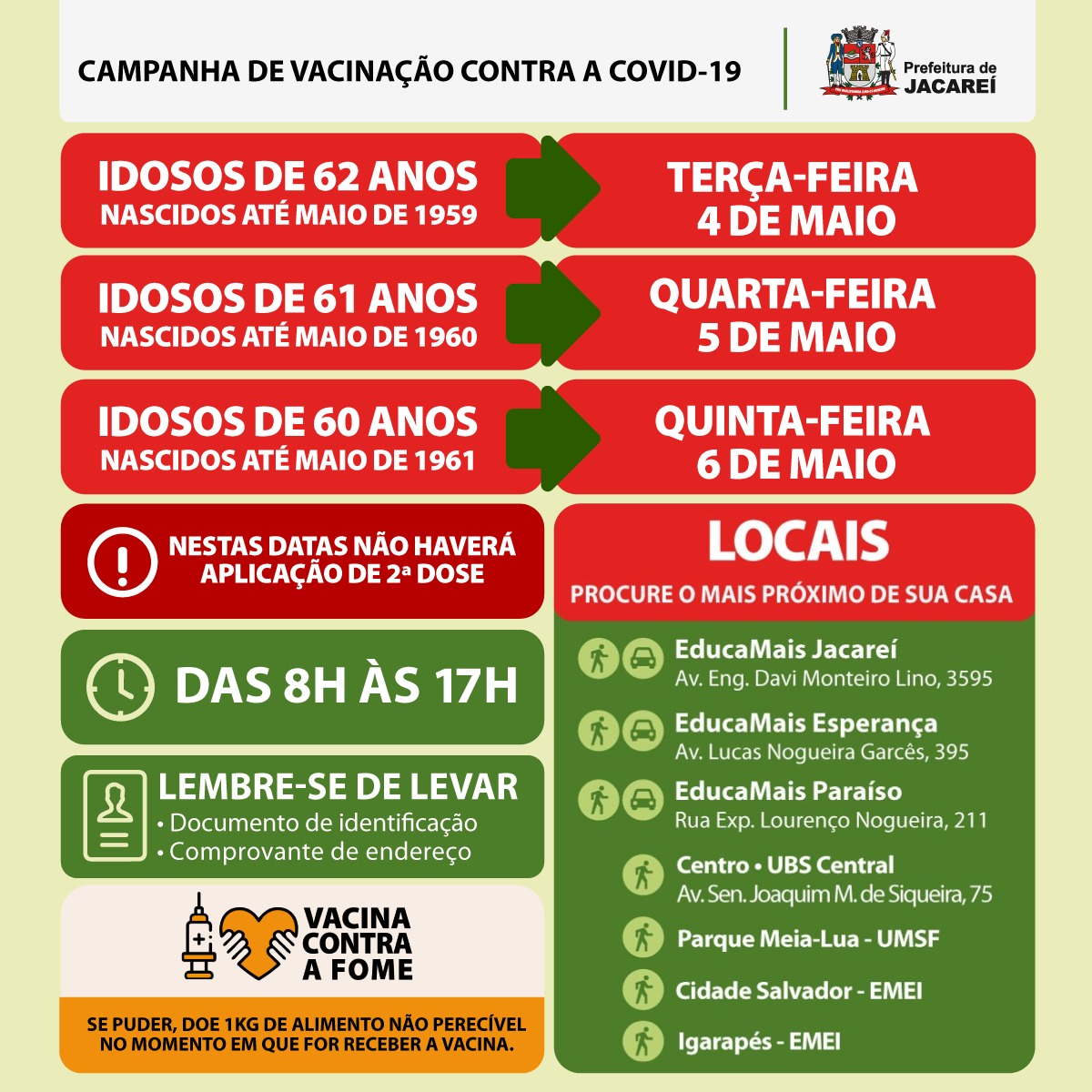 Na terça-feira (4), poderão receber a primeira dose da vacina todos os idosos nascidos até 31 de maio de 1959 (62 anos). Na quarta-feira (5), a aplicação será destinada aos idosos nascidos até 31 de maio de 1960 (61 anos). Já na quinta-feira (6), serão vacinados os idosos nascidos até 31 de maio de 1961 (60 anos).